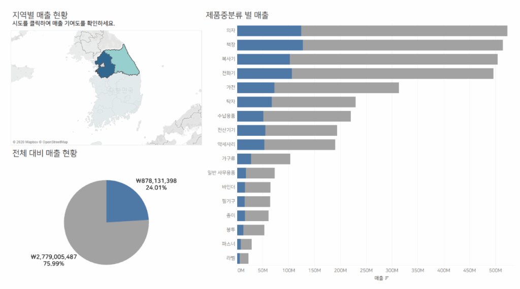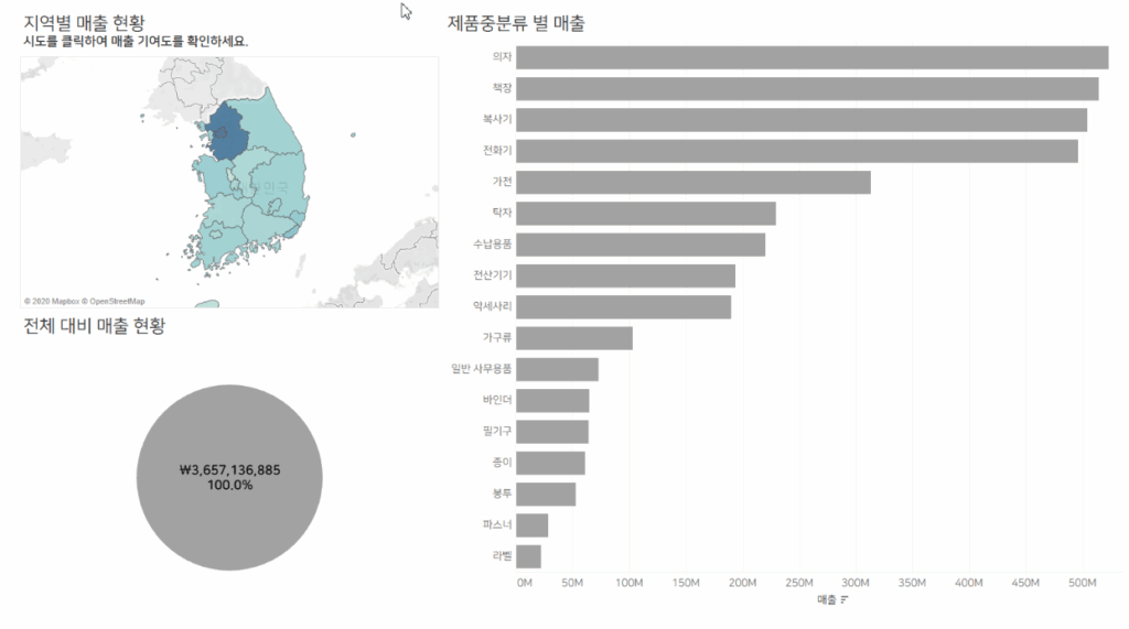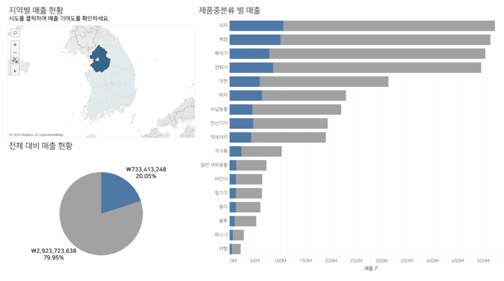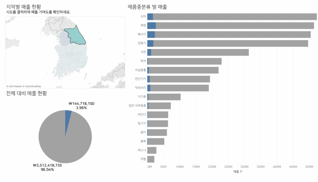 강원도를 선택하면 → 아래의 대시보드 이미지와 같이 “강원도의 전국 대비 매출 비중”과 “제품중분류별 전체 대비 매출 비중”이 파란색으로 나타나고.