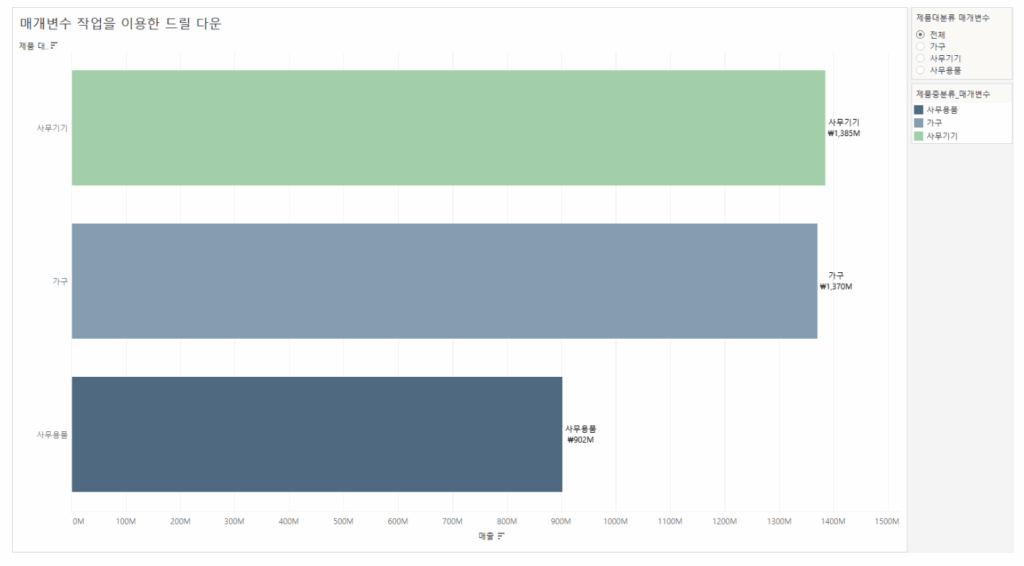 특정 대분류 막대를 클릭했을 때 → 해당 대분류의 중분류 수준으로 매출과 구성 비율을 보이도록 합니다.
