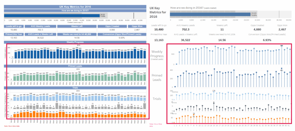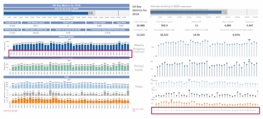 막대 차트는 무난하게 사용 가능하지만, 대시보드 중앙에 색상과 요소가 너무 많아 복잡해보입니다. 대안으로 선택한 “롤리팝 차트”는 잉크의 사용을 줄이면서도, 값의 위치 표현함으로써 여전히 효과적으로 정보를 전달할 수 있습니다.