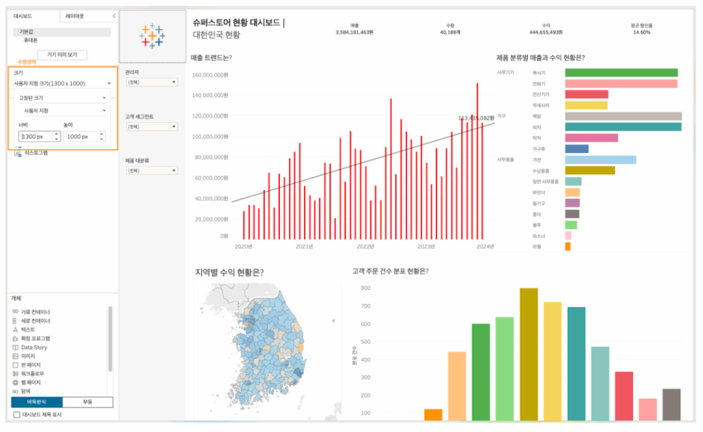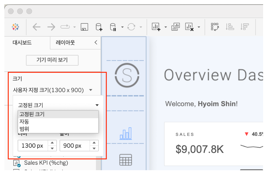 Tableau에서는 대시보드 크기를 “자동, 고정된 크기, 범위”로 사용할 수 있습니다.