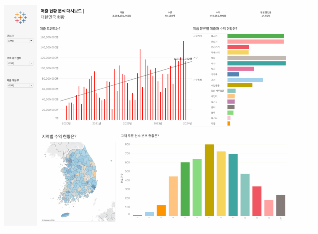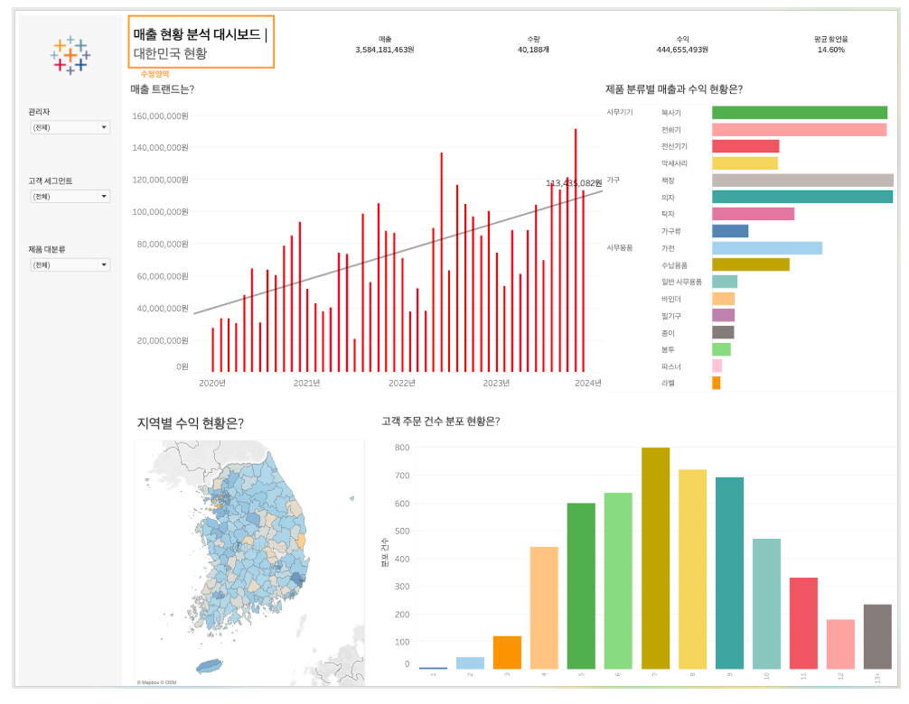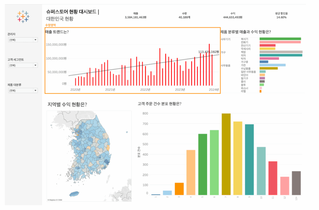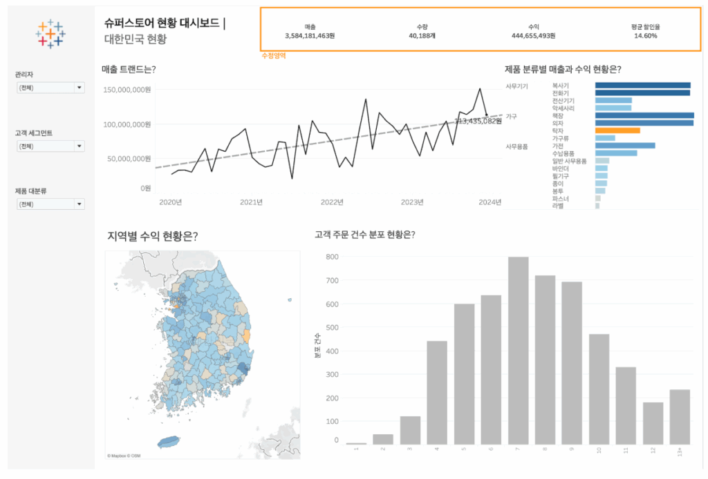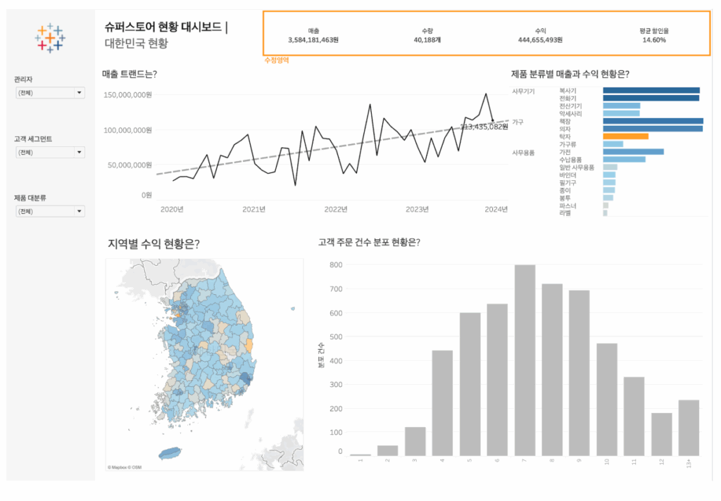 - 현재 대시보드의 제목은 ‘매출 현황 분석 대시보드’입니다. 그러나 아래 차트를 보면 매출만 설정 된 것이 아닌, 수량, 수익, 주문 건수 등 다양한 KPI 지표가 나타나 있습니다.