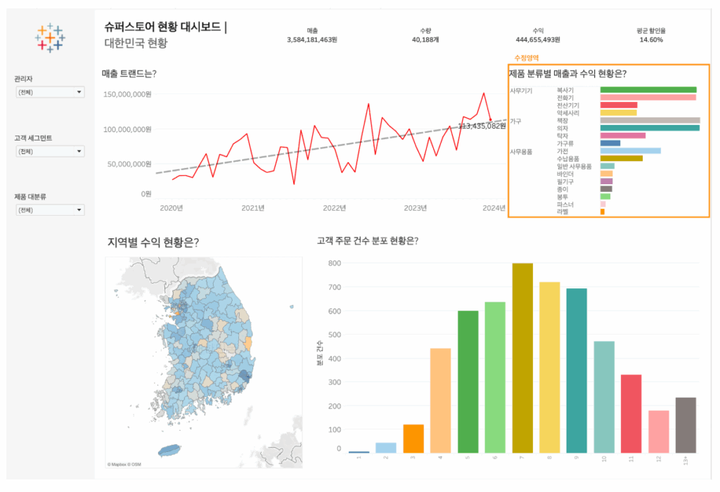 - “제품 분류별 매출”과 “수익 현황 막대 차트”는 현재 수익의 크기를 전혀 반영하고 있지 않습니다.