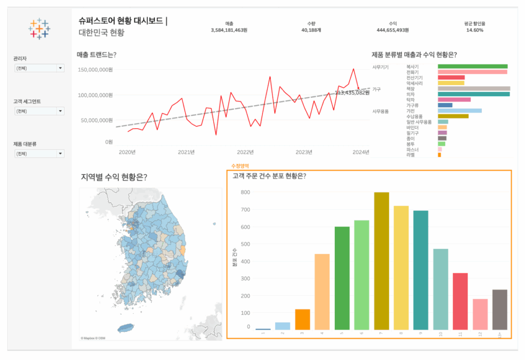 - “고객 주문 건수 분포 현황 차트”의 색상이 불필요하게 너무 알록달록합니다.