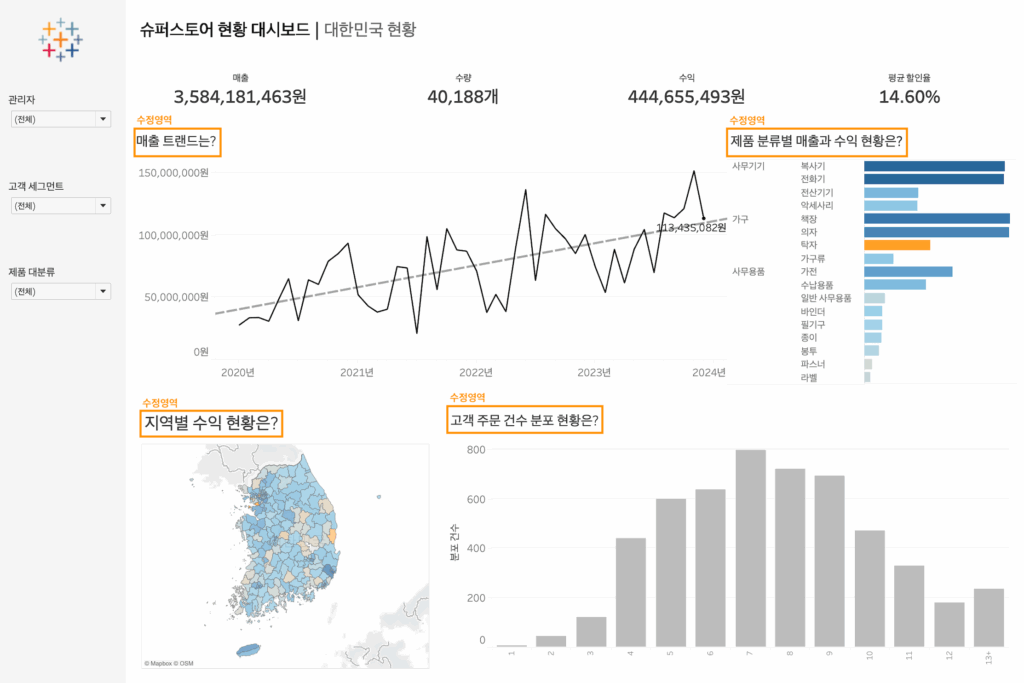 - 그렇다면 어떻게 수정해야 좋은 제목이 될 수 있을까요? 이번 과제에서는 대시보드의 대제목을 “슈퍼스토어 현황 대시보드”라고 수정해보겠습니다.