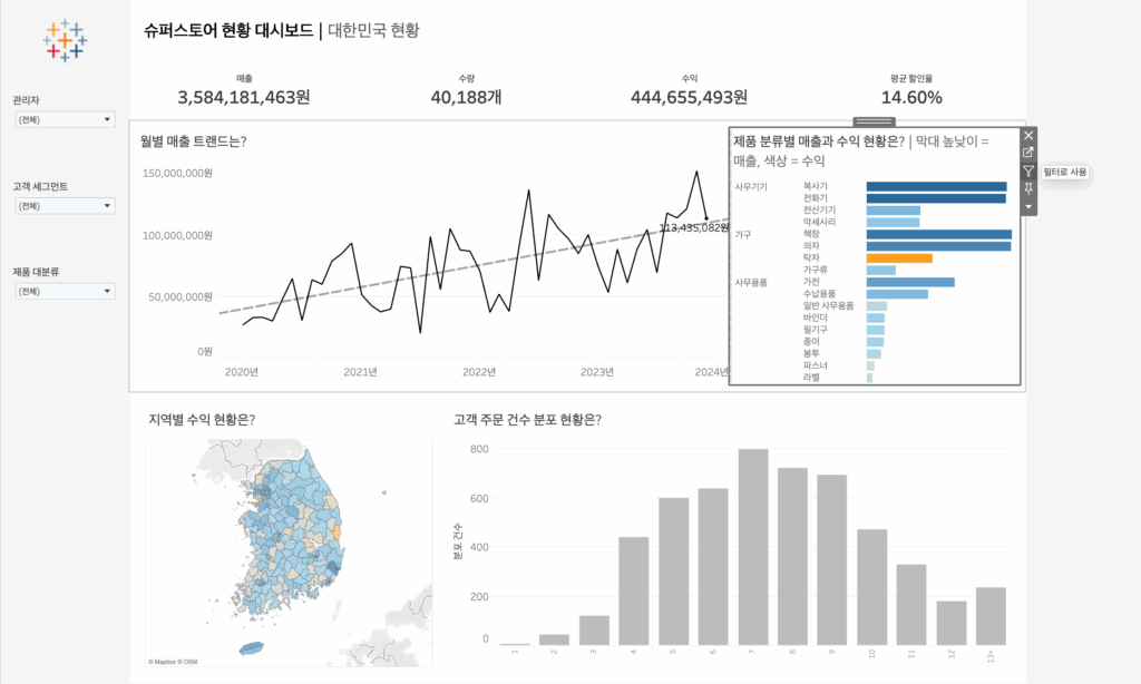 태블로에서 각 차트마다 “필터로 사용”이라는 기능을 클릭하면 해당 차트가 필터가 되어, 다른 영역의 차트도 해당 데이터에 따라 필터가 됩니다.