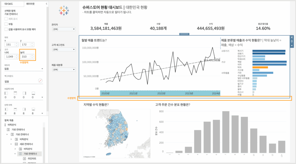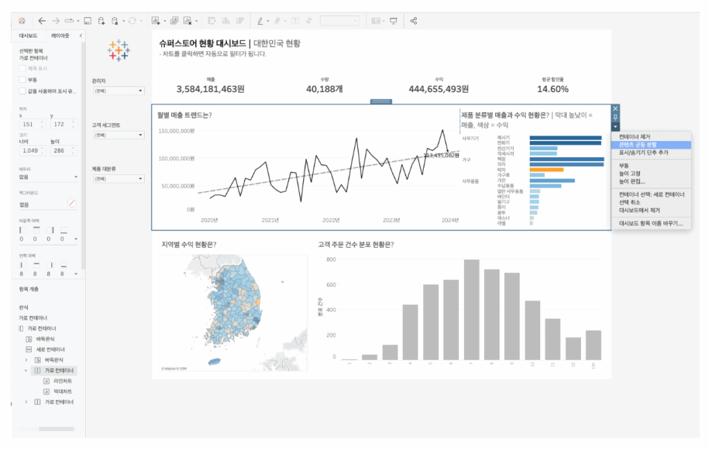- 1단계 : 라인차트 (매출트렌드), 막대차트 (제품 분류별 매출과 수익 현황), 구간과 맵차트 (지역별 수익 현황), 막대차트(고객 주문 건수 분포 현황) 구간의 크기를 동일하게 구성해봅시다.