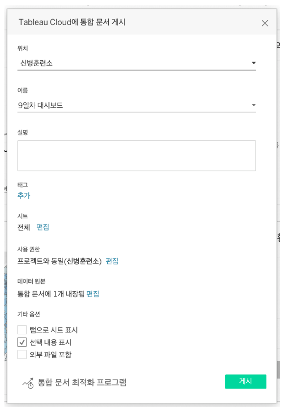 3단계 : 게시 버튼을 눌러 태블로 서버에 대시보드를 게시합니다.