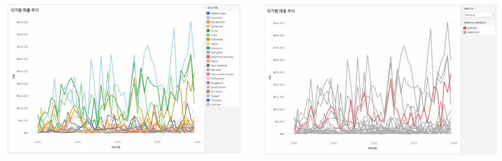 - 왼쪽 대시보드 그림 : 모든 국가를 동시에 서로 다른 색상으로 구분하다 보니, 오히려 그 어떤 내용에도 집중할 수 없어 시선이 분산됩니다.